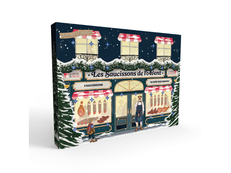 Ce calendrier de l’Avent ravira les amateurs de saucisson avec une sélection variée et gourmande : 3 saucissons secs de 115 g – pur porc, au Cantal et aux noix – ainsi que 84 mini saucissons (grignotes) déclinés en 9 saveurs authentiques : pur porc, noisette, chorizo, Cantal, olives, truffe et parmesan. Un assortiment généreux qui met à l’honneur le savoir-faire charcutier français, entre recettes traditionnelles et associations originales, pour une dégustation festive et savoureuse chaque jour de l’Avent.