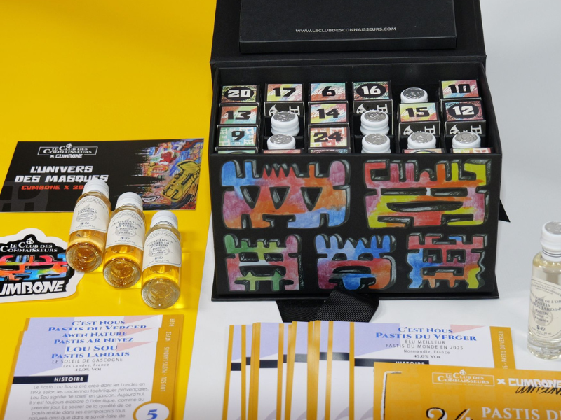 Plongez dans la magie des fêtes avec ce calendrier de l’Avent unique, dédié à l’un des spiritueux les plus emblématiques du Sud de la France : le pastis. Édition exclusive 2025, ce coffret a été conçu en collaboration avec l’artiste Cumbone, qui signe un design original et artistique. Présenté dans un élégant écrin noir mat à ouverture magnétique, il arbore 24 masques totémiques brillants, chacun représentant un producteur de pastis, à découvrir derrière l’un des flacons soigneusement sélectionnés.