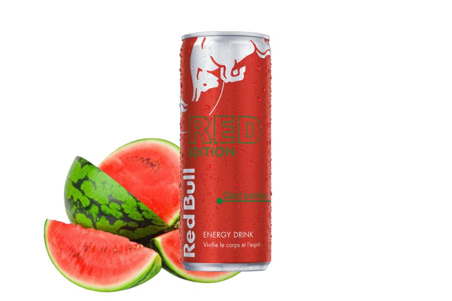 - Red Bull Red Edition – déclinaisons fruitées comme la fraise et la pastèque.