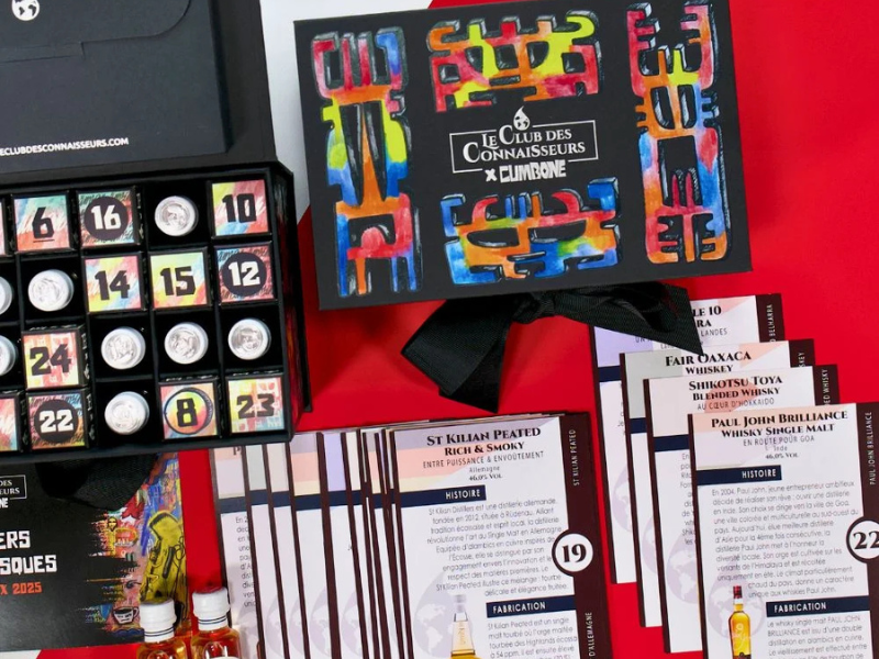 Offrez-vous une expérience sensorielle inoubliable avec le Calendrier de l’Avent Whisky 2025, une édition exclusive signée par l’artiste Cumbone, qui sublime cette collection avec un design unique et contemporain. Présenté dans un écrin noir mat à fermeture magnétique, ce coffret allie élégance et raffinement, en faisant un véritable objet de collection pour tous les amateurs de spiritueux.