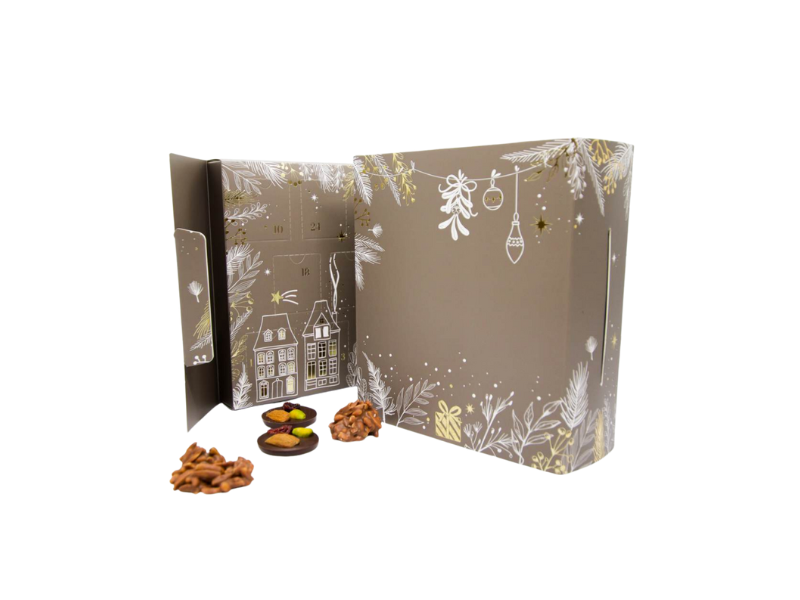 Au fil des jours, découvrez un éventail de créations chocolatées mêlant chocolat noir et au lait : croustillantes céréales soufflées enrobées, mendiants, bonbons au chocolat au sarrasin, délicieuses fritures et savoureux pralinés. Chaque case cache une ou plusieurs pièces, pour une expérience toujours surprenante et gourmande.